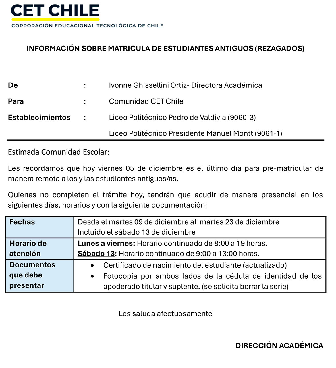 Saludos cordiales Dirección Académica CET Chile – Corporación Educacional Tecnológica de Chile – cetchile.clRead more